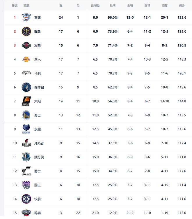 今日比赛后湖人、掘金、火箭排名互换,其他西部球队排名不变。