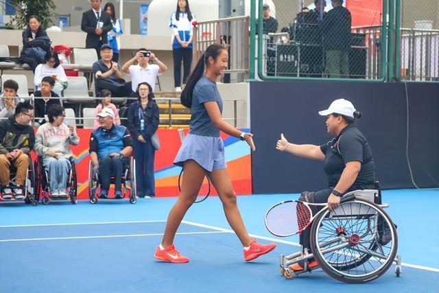 “一站一坐”表演赛成为整场活动的高潮。黄惠敏与邵羽杉组成“中青组合”,对战亚历山德拉·克鲁尼奇与马梓茜的“中外组合”。根据规则,轮椅运动员允许球两跳,站立运动员则为一跳。在比赛中,四位运动员不分国籍、不论“站与坐”,只以网球对话。比赛中,轮椅运动员灵活地移动与精准击球,站立运动员的奔跑与协作,共同勾勒出体育最美的模样。