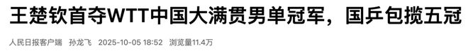 来源:人民日报客户端、央视新闻客户端 王楚钦首夺WTT中国大满贯男单冠军,国乒包揽五冠 WTT中国大满贯男单决赛,王楚钦4-0战胜法国选手费利克斯·勒布伦,夺得冠军,成就本届赛事男单、男双、混双“三冠王”。 10月5日,WTT世界乒联中国大满贯在北京首钢园结束所有赛程。在最后进行的男单决赛中,中国队选手王楚钦以4∶0战胜法国队选手费利克斯·勒布伦,首次夺得WTT中国大满贯男单冠军。中国乒乓球队收获本届赛事全部5个单项冠军,同时包揽女单、男双和混双3个单项冠亚军。 |