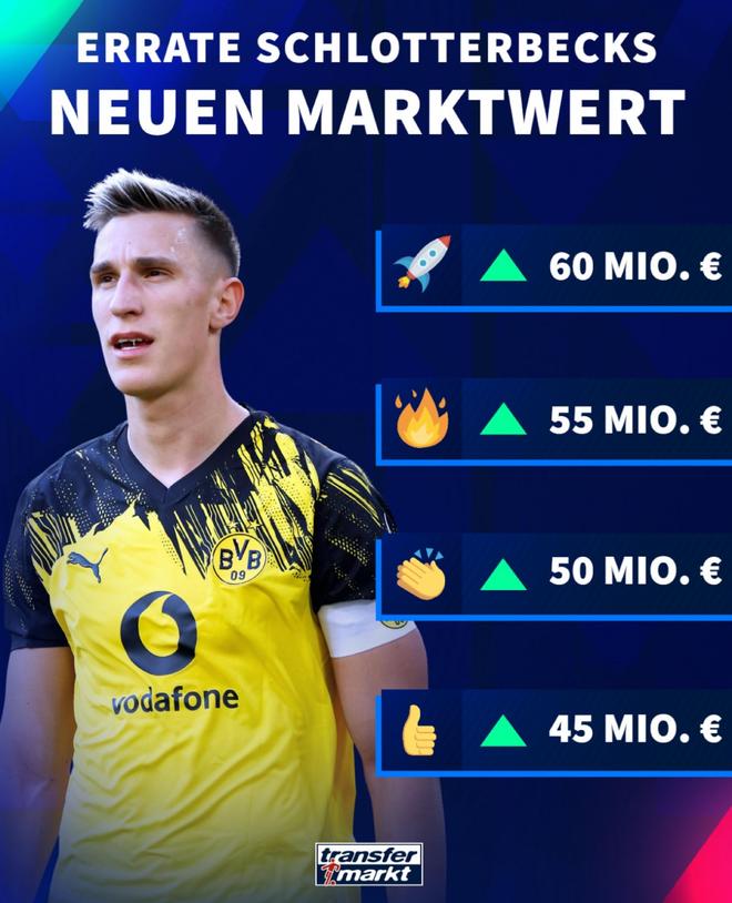 | 德转即将对德甲球员的身价进行更新。今日德转预热多特后卫施洛特贝克身价,球员最高从4000万欧涨至6000万欧。