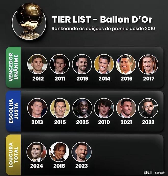 2016年的C罗获得了两个重要团队荣誉:欧冠和欧洲杯冠军。个人赛事出场55次进51球和17个助攻,其中皇马42场38球,葡萄牙国家队13场13球。对于此,妥妥的世界第一,无争议。 2017年,C罗更是延续了上赛季的超级状态,尤其是在欧冠联赛中疯狂打进了12球,个人连续五个赛季问鼎欧冠最佳射手。同时皇马获西甲和世俱杯的桂冠,在最终的金球奖排名中他得到了946分,第二名的梅西则获得670分,毫无悬念地获胜。 略微有争议的获奖大致有6个,分别是2013年的C罗,分歧点主要在于投票的延期所致。当然即使机会给到了C罗,葡萄牙巨星只是利用规则顺势抓住了那稍纵即逝的机会,这显然也是能力的最有力体现。 三冠王里贝里客观来说一点都不冤,毕竟他并非球队的绝对核心,即使不是C罗获奖,那么获得金球奖的那个人也会是梅西。 梅西则有三个金球奖也存在争议点,首先是2010年,合并后的金球奖采用了3票制。哈维和伊涅斯塔的同质性太强,这样造成的分票很难避免,但是作为前锋的阿根廷球星则又在个人数据上形成了断崖式的领先,也因此最理想的做法就是颁发给梅西。 至于说一直都喋喋不休的里贝里则根本无法撼动这三位巴萨巨星的排名,毕竟在教练投票和队长投票上面他都是最低的。 2015年的梅西率领巴萨实现了五冠王伟业,各方面表现依然炸裂,但是人们却在为他的队友内马尔鸣不平,因为巴西人欧冠半决赛上演帽子戏法以及决赛中的连续破门才让诺坎普守住了大耳朵杯。对此,伯虎的看法是有争议,但是不大,毕竟各种奖项评选的都是一整个赛季而非那几场关键的比赛。 2021年梅西斩获了个人的第7座金球奖,这让他的历史地位一下子就提升到了神一般的框架中。但是仅凭一个美洲杯和国王杯就轻松击败其他球员就显得很主观性了,这对于莱万们来说无疑就是一种选择性忽视。如果必须要选有争议的,那么这一年的金球奖可以算一个。 写到结尾处,最有争议的三个金球奖分别是2024年的罗德里,对此弗洛伦蒂诺连续的皇马已经连续两年缺席颁奖典礼以示抗议。2018年的莫德里奇出人意料地成为了罗梅之后的第一个金球奖获得者,坦率来说这个金球奖理应是C罗的。2023年的梅西靠着世界杯的余温直接封神,然而这一次的认证更多地就像是主办方及相关团体的一次造神运动,因为这已经严重脱离了奖项评选的公正性。 |