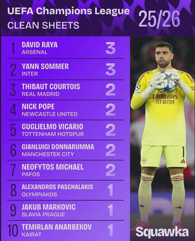 Squawka统计,拉亚和索默尔在本赛季欧冠比赛中3场比赛全部完成零封,阿森纳和国米门将也是仅有的本赛季欧冠尚未失球的门将。