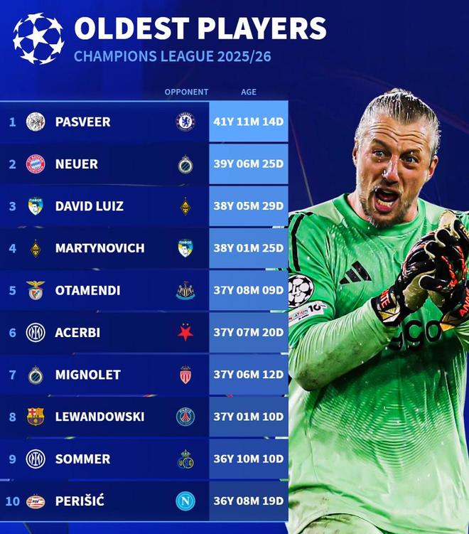 | 北京时间10月25日,德转统计出了本赛季至今欧冠出场最年长的10名球员,阿贾克斯的门将帕斯维尔第一,诺伊尔第二,目前效力于塞浦路斯球队帕福斯的大卫-路易斯第三。