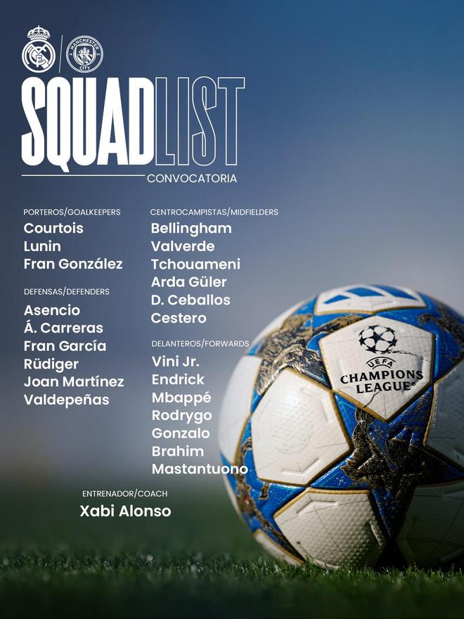 皇马公布欧冠战曼城大名单: