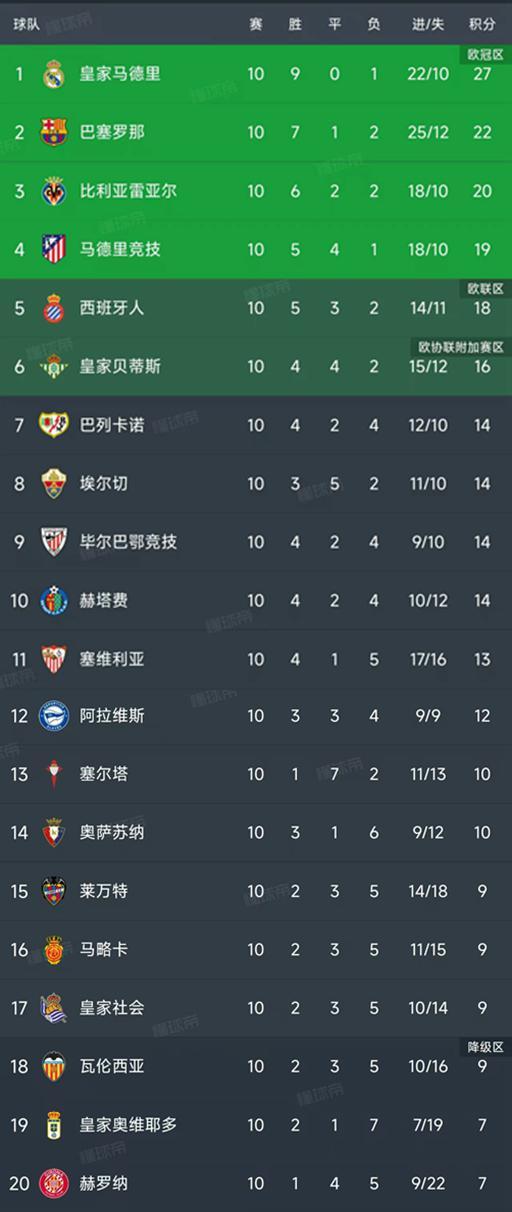 随着马竞20皇家贝蒂斯,西甲第10轮结束了所有比赛,皇马5分领先