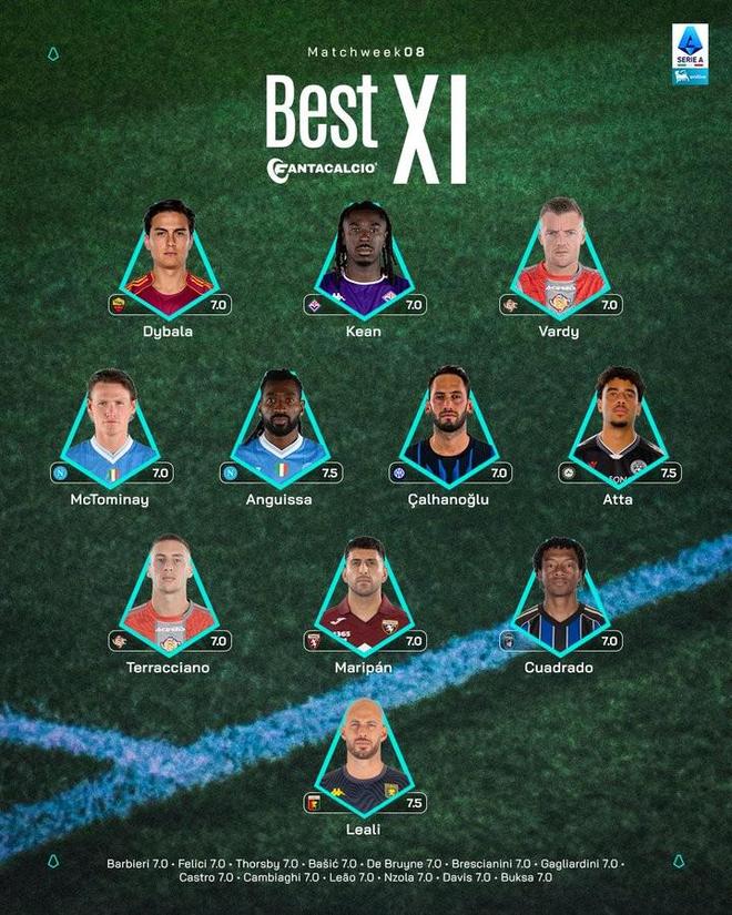 | 北京时间10月27日,意甲官方公布联赛第8轮的最佳阵容,恰尔汗奥卢、麦克托米奈、迪巴拉、瓦尔迪入选。