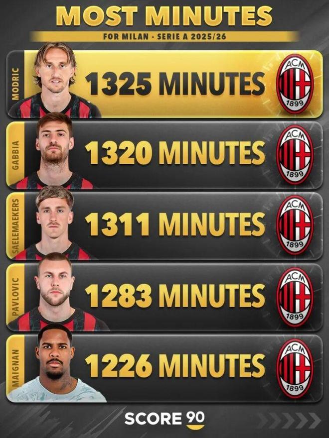 | 米兰圈 Score90统计了米兰球员本赛季意甲出场时间,并列出榜单,40岁莫德里奇1325分钟居首,他仅有25分钟未在场上。