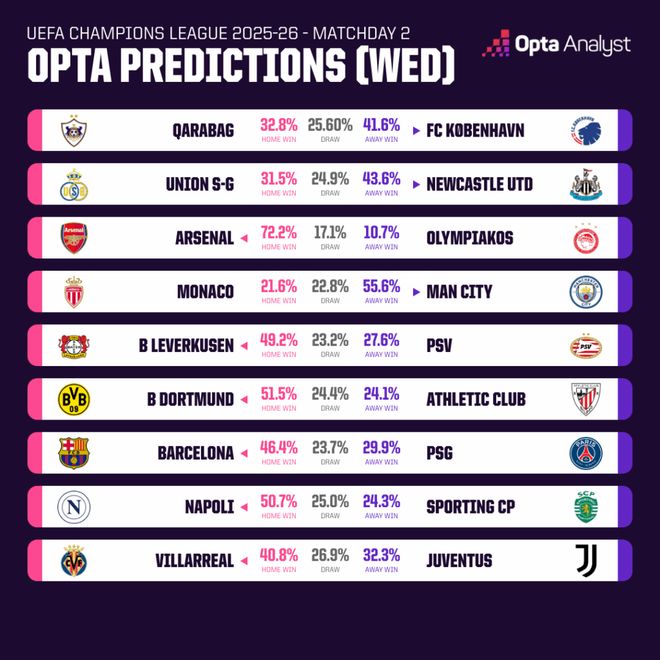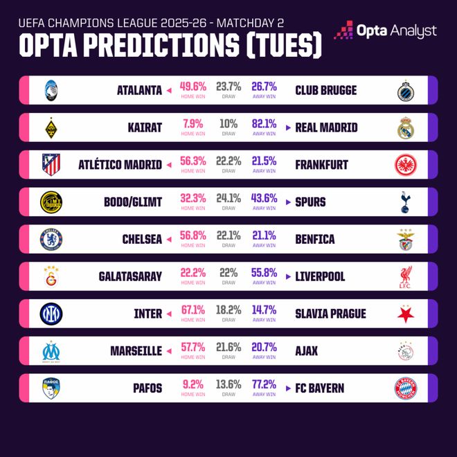 Opta超级计算机将全程陪伴2025-26赛季欧冠联赛,通过数据模型为所有比赛和赛季结果提供预测支持。 巴黎圣日耳曼上赛季首次夺得欧冠冠军,在决赛中5-0大胜国际米兰。尽管许多人认为他们将再次成为夺冠热门,但Opta超级计算机并未将其列为赛季前的最大热门。 英超双雄利物浦和阿森纳更被看好,尽管两队在2024-25赛季均被巴黎圣日耳曼淘汰。 本赛季共有六支英格兰球队参加欧冠联赛,除上述两队外,还包括曼城、切尔西、纽卡斯尔联以及欧联杯冠军托特纳姆热刺。 皇家马德里是欧冠历史上夺冠次数最多的球队(15次),其中9次是在1992年欧冠改制后获得。 阿隆索将在执教"白衣军团"的首个赛季力争再添一冠。其他欧洲豪门也将角逐这项欧洲足坛最高荣誉,包括拜仁慕尼黑、巴塞罗那、尤文图斯、国际米兰、马德里竞技和那不勒斯。 以下是Opta分析师基于超级计算机数千次模拟得出的第二轮比赛详细预测。 周三比赛日(欧洲时间9月30日) 2025-26赛季欧冠联赛第二轮将于周二率先打响两场早场比赛,其中一场堪称欧冠历史上声望最悬殊的对决之一。 皇家马德里将前往哈萨克斯坦最大城市阿拉木图对阵凯拉特。 在Opta实力排名中,这支哈萨克球队比皇马低423位,而这仅是他们的第二场欧冠比赛——自1992年欧冠改制以来,皇马的参赛场次(332场)超过任何其他球队。 这家西甲豪门已在欧冠赛事中击败过111个不同对手,比其他任何球队都多。 不过,在过去30次面对首次交锋的球队时,皇马输掉了其中3场(24胜3平),分别是2024年1-0负于里尔、2021年1-2负于谢里夫和2016年0-2负于沃尔夫斯堡。 但Opta超级计算机认为历史不会重演,在10,000次赛前模拟中,皇马仅输了7.9%的场次,胜率高达82.1%。 然而,超级计算机更看好周二另一场早场比赛的主队——亚特兰大在对阵布鲁日的模拟中胜率为49.6%。 这可能让一些人感到意外,因为比利时俱乐部在上赛季欧冠附加赛中主客场双杀亚特兰大,并且本赛季欧冠首战4-1大胜摩纳哥。 这支意甲球队在首轮0-4惨败给巴黎圣日耳曼后迅速调整,随后在意甲联赛中客场3-0击败都灵、客场1-1战平尤文图斯,主场优势可能成为关键因素。 马德里竞技在周六的西甲德比中5-2大胜皇马,终结了阿隆索自8月初以来的七连胜。 他们将在周二迎战法兰克福,后者在本周末的国内联赛中也上演了一场进球大战——周六在德甲客场6-4击败门兴格拉德巴赫,上半场就取得六球领先。 法兰克福本赛季七场正式比赛场均产生5.9个进球,因此这场比赛也可能是一场进球盛宴。超级计算机对马竞充满信心,西班牙俱乐部在赛前模拟中的胜率为56.3%。 切尔西的胜率相近(56.8%),本周他们将在斯坦福桥迎战老熟人。 穆里尼奥将率领本菲卡造访伦敦,这位葡萄牙教头曾两度执教蓝军,赢得三次英超冠军、三次联赛杯冠军和2007年足总杯。 62岁的穆里尼奥在各项赛事中14次面对老东家,仅赢下4场(3平7负),且近七次交锋未尝胜绩,上一次取胜还是2018年2月,当时他执教的曼联在英超中2-1击败切尔西。 当天晚间,国际米兰(对阵布拉格斯拉维亚,胜率67.1%)和马赛(对阵阿贾克斯,胜率57.7%)有望主场取胜。 英超双雄利物浦(客场对阵加拉塔萨雷,胜率55.8%)和托特纳姆热刺(客场对阵博多格林特,胜率43.6%)预计将摆脱周末联赛的低迷表现,在欧冠第二轮客场全取三分。 拜仁慕尼黑在首轮3-1击败切尔西,哈里·凯恩梅开二度,开启了本赛季的欧冠征程。 这位英格兰队长随后在德甲又打入五球,使他在拜仁的总进球数达到100个,仅用104场比赛——比C罗纳尔多在皇马(105场)和哈兰德在曼城(105场)都要快一场。他们将在周二前往塞浦路斯对阵帕福斯,此前拜仁在欧战中六次对阵塞浦路斯球队全部取胜,总比分31-2。 超级计算机预测拜仁将延续这一出色战绩,胜率77.2%,而帕福斯仅为9.2%。 周四比赛日(欧洲时间10月1日) 周四的欧冠赛事将以两场超级计算机预测客胜的比赛拉开帷幕。 圣吉罗斯联合在首轮客场3-1爆冷击败埃因霍温,但他们将迎来欧冠主场首秀,迎战英超球队纽卡斯尔联。 过去六支比利时球队在欧冠或欧洲冠军杯的主场首秀中保持不败(3胜3平),但Opta超级计算机认为纽卡斯尔将以43.6%的胜率取胜。 喜鹊在主场1-2负于巴塞罗那虽败犹荣,多次给西班牙豪门制造威胁,但他们需要克服周末的伤感情绪——在英超对阵阿森纳的比赛中,尽管在圣詹姆斯公园球场领先至第83分钟,最终仍以1-2告负。 卡拉巴赫在首轮比赛中完成了最大冷门,从0-2落后到3-2逆转本菲卡。他们现在希望首次取得欧冠连胜,并成为首支做到这一点的阿塞拜疆球队。 Opta超级计算机认为这将是一场硬仗,丹麦球队哥本哈根在赛前模拟中的胜率为41.6%。 曼城是另一支被看好的客队,瓜迪奥拉的球队对阵摩纳哥的胜率为55.6%。哈兰德希望在首轮对阵那不勒斯成为最快达成欧冠50球的球员后继续进球。 孔蒂执教的那不勒斯主场迎战里斯本竞技,有望取得本赛季欧冠首分(胜率50.7%,平局25.0%),而比利亚雷亚尔(对阵尤文图斯,40.8%)和勒沃库森(对阵埃因霍温,49.2%)在赛前模拟中的胜率也高于败率。 阿森纳是本轮赛事中超级计算机最有信心的预测,阿尔特塔的球队在10,000次模拟中以72.2%的胜率击败奥林匹亚科斯。 然而历史表明,实际情况可能不如超级计算机预测的那么轻松——希腊球队过去三次造访酋长球场均取得胜利:2015年9月的欧冠胜利,以及2019-20和2020-21