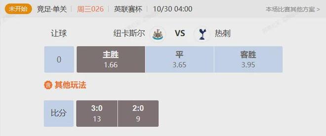 | 网易红彩今日挑选专家陈亦明带来一场英联赛杯赛事解析,更多精彩方案可下载“网易红彩”App进行查阅! 1.专家:陈亦明 竞足 周三026英联赛杯纽卡斯尔VS热刺 开赛时间:2025-10-30 04:00:00