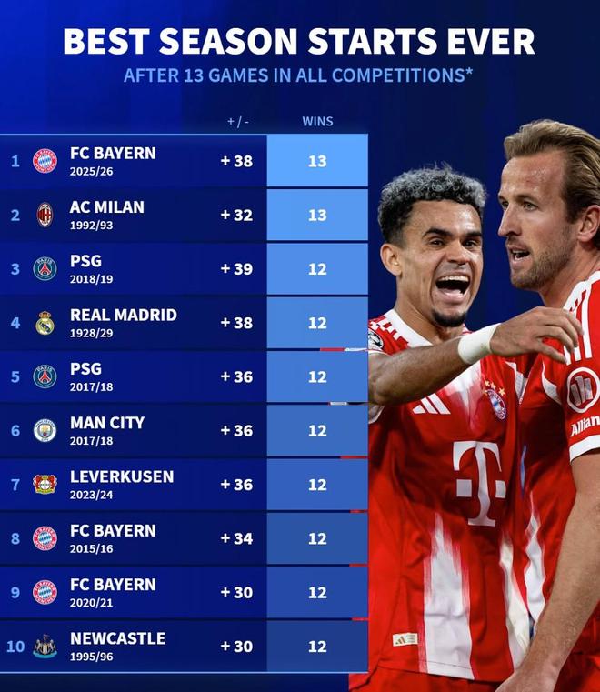 五大联赛开季13场历史10佳成绩:拜仁13战全胜+净胜38球第一